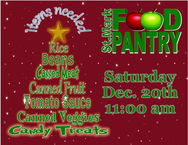 St . Mark gathers cans of food and other non-perishable food items for needy families around the area. Food distribution is on the third Saturday of each month from 11:00 AM to 12:00 PM at the Church Sanctuary Enterance. (For a list of items needed see our monthly newsletter)