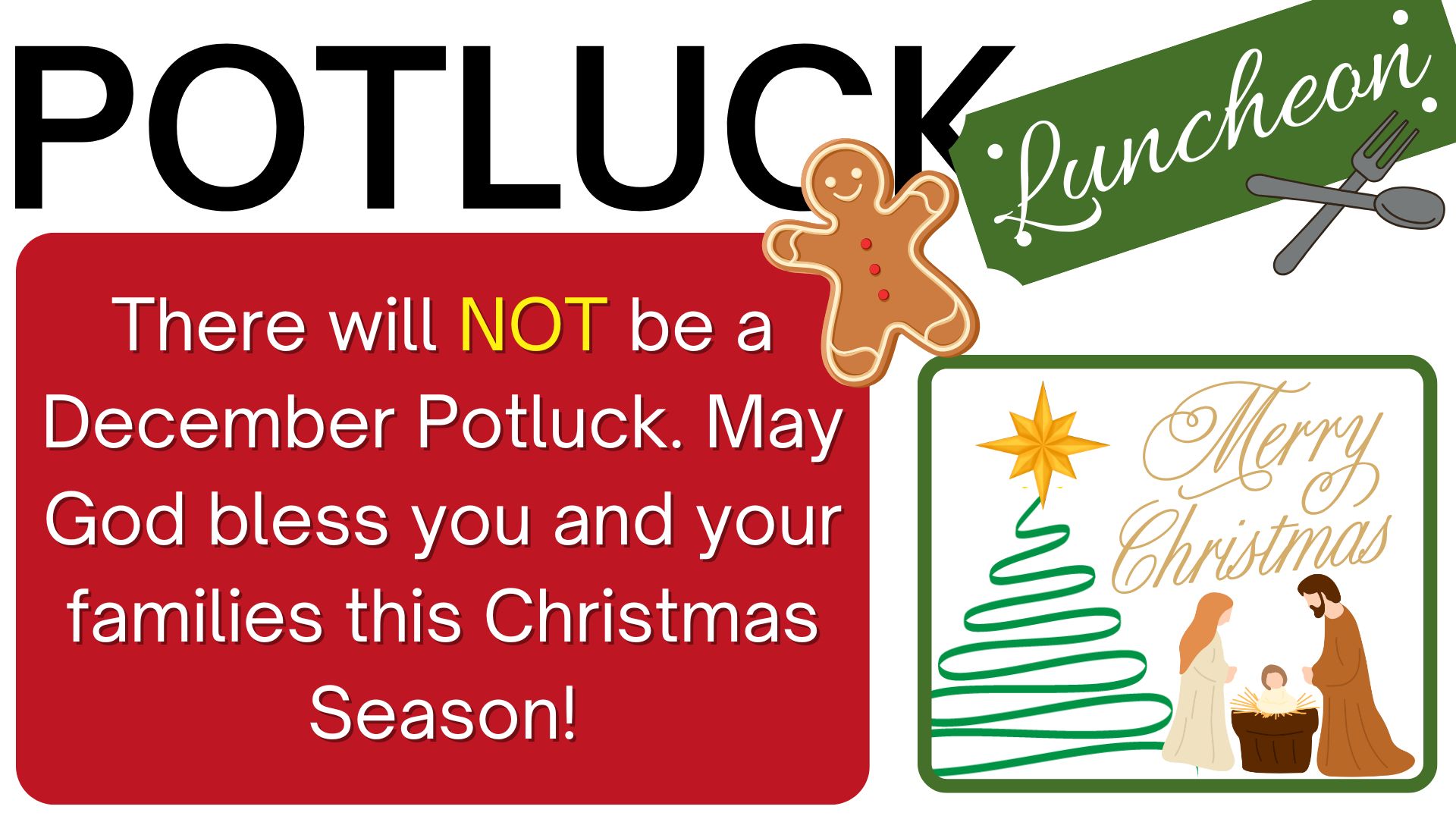 The congregation of St . Mark UMC gathers together at the end of each month for nice fellowship and good potluck food after the service. We welcome you to join us! Food is always plentiful so don't worry if you don't bring anything. There will NOT be a December Potluck due to the Christmas Season!